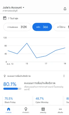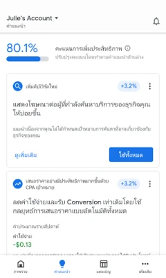 ไม่เพียงแค่การตรวจสอบและจัดการเท่านั้น Google Ads ยังช่วยให้คุณเพิ่มประสิทธิภาพของแคมเปญด้วยคะแนนการเพิ่มประสิทธิภาพและคำแนะนำเชิงกลยุทธ์ที่อิงจากข้อมูลจริง รับการแจ้งเตือนสำคัญแบบเรียลไทม์ ไม่ว่าจะเป็นสรุปผลการดำเนินงานประจำวันหรือการแจ้งเตือนเกี่ยวกับโฆษณาที่ไม่ผ่านการอนุมัติ เพื่อให้คุณแก้ไขสถานการณ์ได้อย่างทันท่วงที และหากต้องการความช่วยเหลือเพิ่มเติม คุณสามารถเชื่อมต่อกับผู้เชี่ยวชาญผ่านการโทรหรือแชทได้ทุกเมื่อ มั่นใจได้ว่าทุกขั้นตอนของการทำโฆษณาออนไลน์ของคุณจะได้รับการดูแลอย่างดีที่สุดด้วย Google Ads