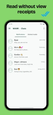 WAMR: เปิดเผยข้อความที่ถูกลบ! ไม่พลาดทุกการสนทนาอีกต่อไป กู้คืนข้อความ รูปภาพ และวิดีโอที่ถูกลบจากแอปแชทของคุณ อ่านข้อความอย่างเป็นส่วนตัวโดยไม่ส่งใบตอบรับการอ่าน ค้นพบสิ่งที่คุณพลาดไป