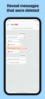 เบื้องหลังการทำงานที่ชาญฉลาด WAMR ใช้ประโยชน์จากประวัติการแจ้งเตือนบนอุปกรณ์ของคุณเพื่อสร้างสำเนาสำรองของข้อความที่เข้ามาอย่างรอบคอบ เมื่อมีข้อความถูกลบ WAMR จะแจ้งเตือนคุณทันทีและดึงเนื้อหาจากข้อมูลสำรองที่จัดเก็บไว้ ทำให้คุณไม่พลาดทุกข้อมูลสำคัญอีกต่อไป ยิ่งไปกว่านั้น คุณยังได้รับอิสระในการอ่านบทสนทนาทั้งหมดโดยไม่ต้องทิ้งร่องรอย "อ่านแล้ว" ซึ่งหมายถึงการกลับมาของความเป็นส่วนตัวอย่างแท้จริงในทุกการแชทของคุณ